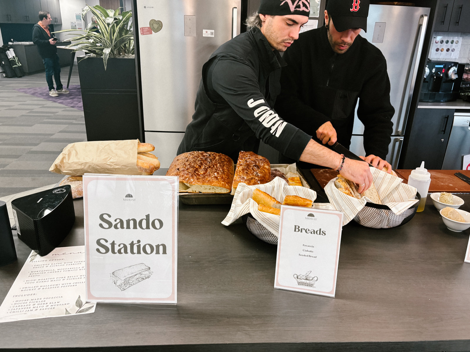 The Sando Station is a live lunch experience designed for teams. Our crew arrives at your office, sets up a mini sandwich bar, and builds made-to-order sandos just how your team likes them. Perfect for: